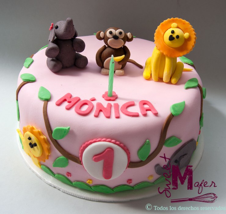 Mónica es hija de Angela María y Lucas, a quienes hace unos años les hice su torta de matrimonio y que además son papás de Sebastián, a quien le he hecho varias tortas de cumpleaños. En esta ocasión, Mónica cumplió su primer año, y Angela le organizó una fiesta de la selva. Me encargó una torta de 15 porciones de vainilla con capa de chocolate, unos cupcakes de chocolate y galleticas con la M y el 1 y caritas de animales, a juego con la torta. Unos días después, Angela escribió para agradecernos porque les gustó mucho todo!