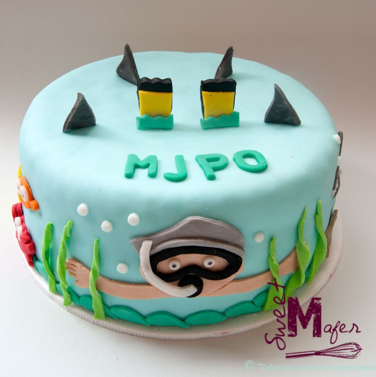 El jefe de Andrea cumplió años, ella y sus compañeros querían sorprenderlo y tener un detalle con él, su hobby es el buceo y me encargaron esta torta de vainilla con capa de mora para 15 porciones con 12 cupcakes a juego, decorados con detalles marinos. ¡Les encantó y el jefe quedó feliz!