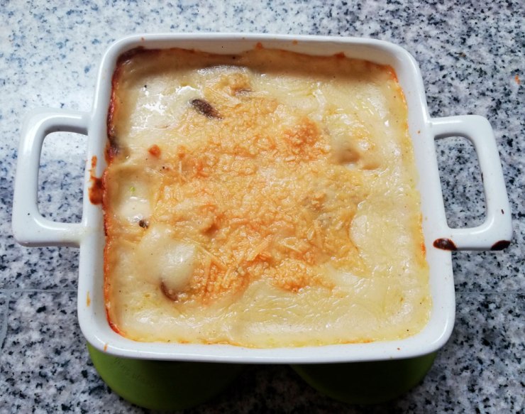 Soferír la cebolla con mantequilla. Poner los champiñones y cocinarlos. Poner laurel y nuez moscada, agregar caldo de pollo y leche, vino blanco, disolver maizena unas 4 cucharadas en un poco de leche fría y poner en la mezcla. Incorporar los espárragos partidos en pedacitos de unos 3cm y el pollo en cubitos. Revolver bien y dejar espesar. Debe quedar bien espeso porque el el horno se pone más aguada. Poner en moldes o cazuelas refractarias y cubrir con queso parmesano rallado, meter al horno a 190º y dejar gratinar. Se puede servir con arroz con fideos y ensalada.