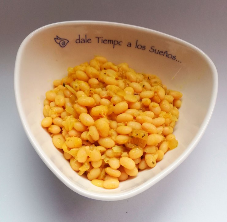 Remojar los blanquillos desde el día antes en agua con vinagre de manzana y unas gotas de limón. En la olla pitadora (o express o atómica) poner a sofreír cebolla. Poner las alubias, agua y sal. Cocinar. A mí me enseñó Susana, mi empleada, a contar el tiempo por pitos, y estas requieren unos de 7 a 9 pitazos para cocinarse.