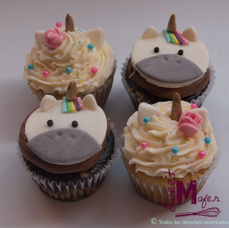 Maribel, una antigua y fiel cliente y amiga de Sweet Mafer, quería sorprender a su pequeña Miranda con unos cupcakes de unicornios, le hicimos unos con caras y otros con las orejas y el cuernito, unos de vainilla y otros de chocolate y ella quedó feliz.