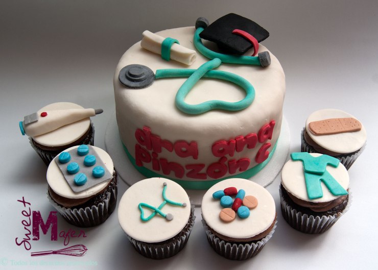 La hija de Ana Lucía se graduó de médica y ella me encargó esta torta con cupcakes a juego para la celebración en casa después de la ceremonia virtual. Era una torta de 10 porciones de chocolate con cupcakes de chocolate. Ana Lucía nos escribió unos días después para darnos las gracias porque les gustaron mucho.