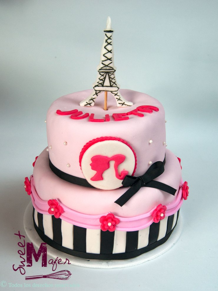 Julieta cumplió años y su mamá, Diana, me encargó una torta de chocolate de 16 porciones decorada con temática de Barbie en París y además hicimos cajas de 2 cupcakes para mandarle a sus amigas para la celebración virtual de cumpleaños. ¡A Julieta le encantó!