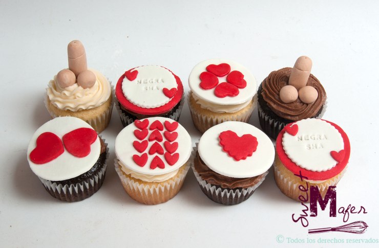 Cupcakes con corazones, pipis y nombres para una despedida de soltera.