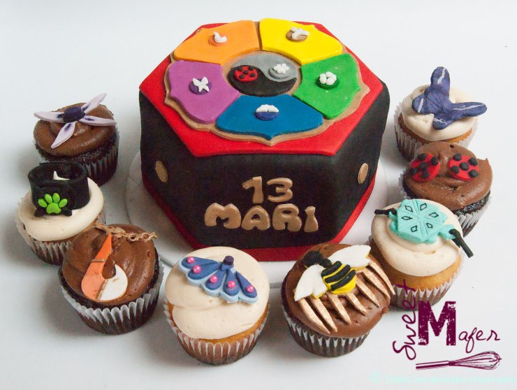La mamá de María del Mar me pidió esta torta en forma de la caja de amuletos y cupcakes a juego con los distintos amuletos de Miraculous. Era una torta de chocolate de 10 porciones y cupcakes de vainilla y chocolate. María del Mar quedó feliz con el resultado.