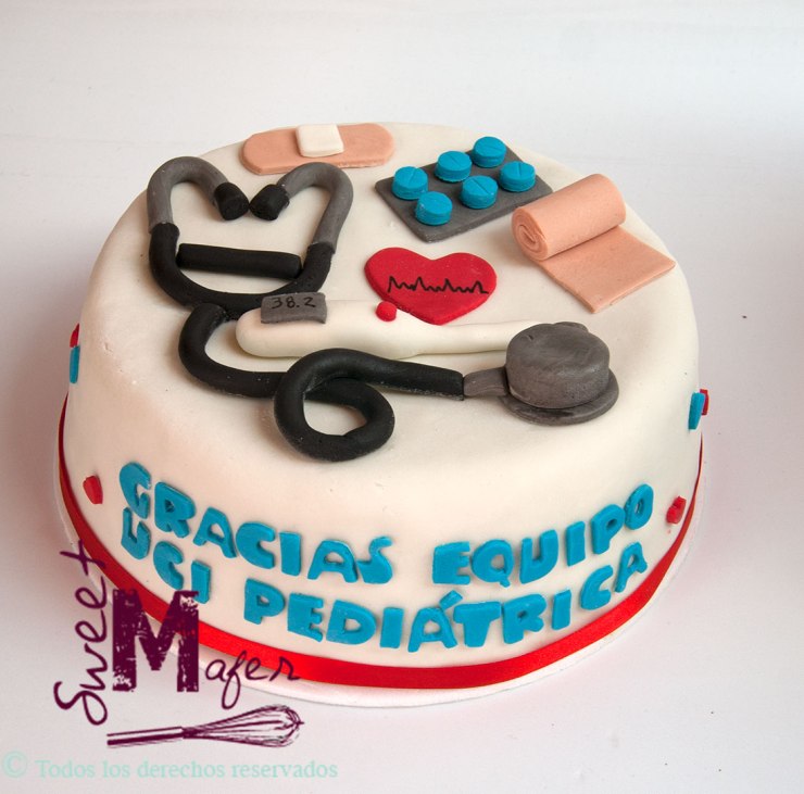 Diana me encargó esta torta para darle al personal médico que atendió a su hijo en la UCI como muestra de su agradecimiento. Era una torta de chocolate de 25 porciones, decorada con un fonendoscopio, un termómetro, un blister de pastillas, una venda y una curita. ¡Les gustó mucho!