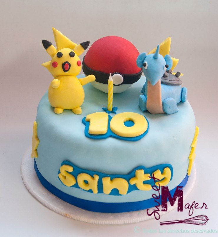 Torta de Pokemon para Santy, de 10 porciones de vainilla con arequipe. ¡Les encantó!