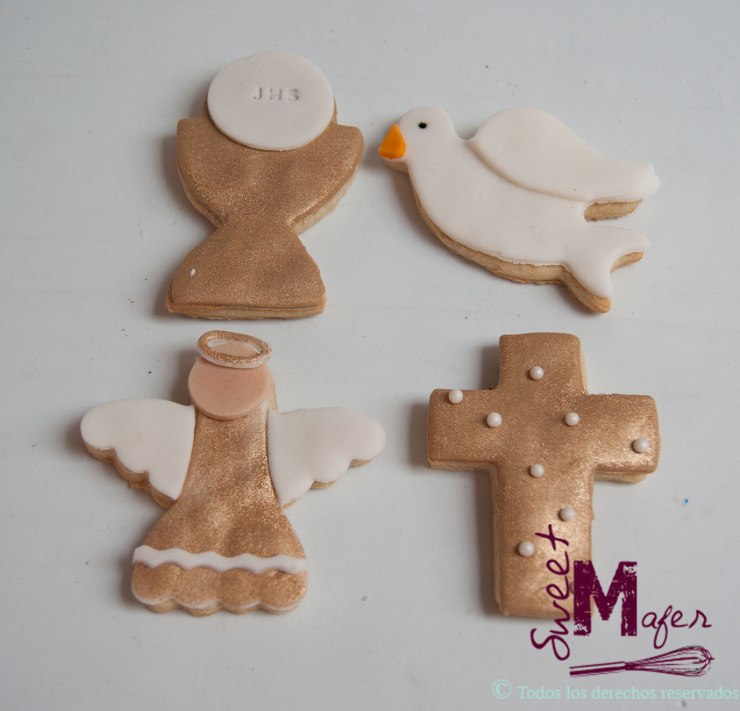 Galletas de primera comunión medianas en tonos dorado y blanco.