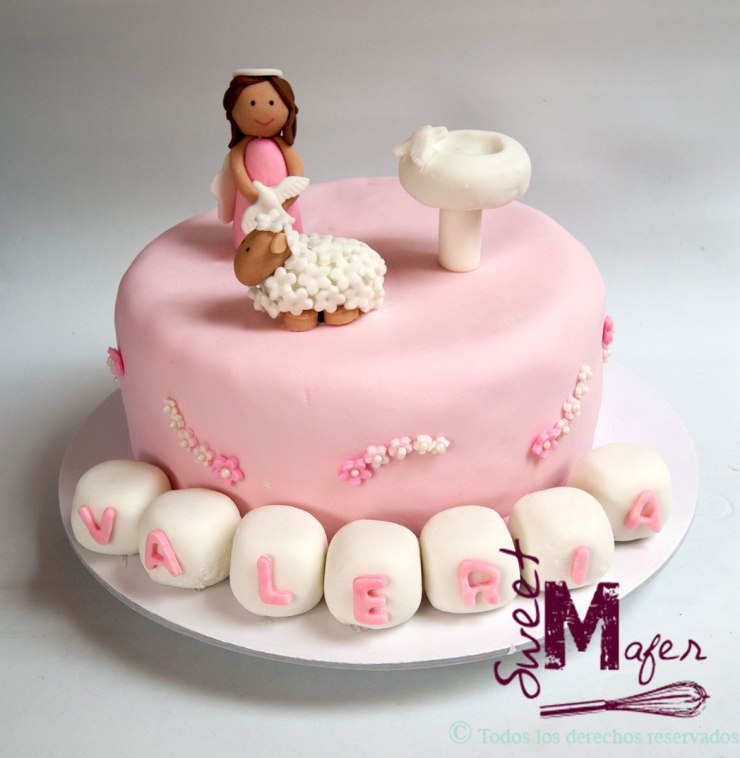 Torta de bautizo para Valeria. Torta de chocolate con mora para 15 personas decorada con un angelito, una oveja y la pila de bautizo.