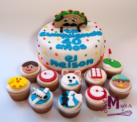 Nelson cumplió 40 y María Jimena, su esposa y una muy buena cliente de Sweet Mafer, nos encargó esta divertida torta decorada con un taco, para hacer juego con la temática mexicana de la fiesta, una torta de chocolate para 15 personas, y 10 cupcakes decorados con cosas importantes para ellos.