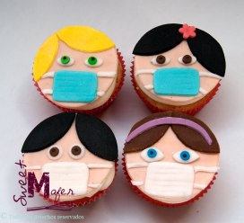 María Teresa me encargó estos cupcakes de chocolate para el cumpleaños de su sobrina, durante la cuarentena, le parecieron muy simpáticos los cupcakes de caritas con tapapocas, que hicimos a los miembros de su familia y al perrito de su sobrina con tapabocas. A María Teresa le encantaron.