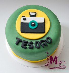 Sandra me encargó esta tortica como regalo de bienvenida para su novio que venía a visitarla desde muy lejos, era una torta de vainilla de 6 porciones, decorada en verde militar y con una cámara encima, porque él es aficionado a la fotografía. Le gustó mucho el resultado.