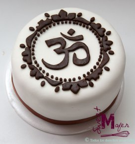 Felipe, el novio de Irene es yogui y ella me pidió esta tortica para decorada con el símbolo de OM para soplarle una velita el día de su cumple. Irene fue compañera mía de colegio y fuimos amigas cuando éramos pequeñas, nos conocemos hace más de 30 años y ella siempre me tiene en cuenta cuando necesita alguna tortica para alguna celebración especial. Es una torta de vainilla con arequipe para 6 personas, decorada en blanco y café con el OM y un marco de flores y hojas. ¡Le gustó mucho!