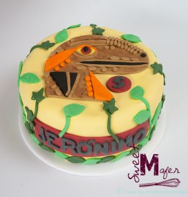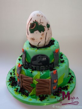 Daniel me encargó esta torta para el cumple de un amigo suyo, su amigo se iba a disfrazar de dinosaurio y era muy importante que la torta tuviera un dinosaurio parecido al del disfraz, saliendo de un huevo. Hicimos una torta de 10 personas, marmolada y quedaron muy contentos con el resultado.