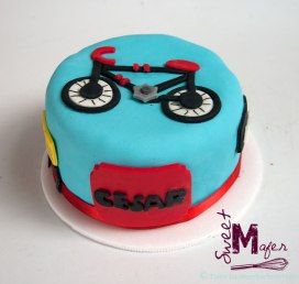 Maribel es una vieja amiga y clienta de Sweet Mafer, en esta oportunidad, me encargó una torta para el cumple de su papá, a quien le encanta el ciclismo. Hicimos una torta de vainilla con mora para 30 personas, la decoramos con pastos, una bicicleta, un aviso con el nombre de Monroy y un 64 en la parte de arriba, además de algunas piedritas y manzanas. ¡Le gustó mucho!