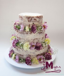 Esta torta de 35 porciones, en masa de vainilla con capa de mora, fue un encargo de Maribel, quien le ayudó a organizar la boda a unos amigos suyos, es un seminaked cake, decorado con flores naturales en tonos a juego con el ramo de la novia.
