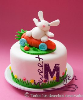 Carolina me encargó esta torta de chocolate de 6 porciones decorada con una conejo y una zanahoria para el cumple de María José.