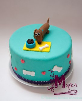 Andrés me pidió esta torta para su novia que adora los perros salchichas, ¡a mí también me encantan! Es una torta marmolada de 6 porciones, cubierta en verde agua con huesitos y corazones y encima tiene un tierno perrito salchicha, con su individual con huellas, un platón con comida y un hueso. ¡Les gustó mucho!