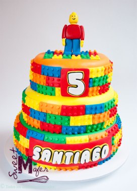 Santiago, el hijo de Patricia cumple años mañana, ayer tuvo una gran fiesta con sus amigos y familiares. A Santiago le encantan los legos, así que hicimos para él esta gran torta de lego, una torta de vainilla con capa de arequipe para 60 personas, decorada con fichas de lego en tonos vivos. La decoración de esta torta, sin contar el tiempo que gastamos cubriéndola, nos llevó más de 5 hora, pues cada ficha es cortada a mano y luego tuvimos que poner cada bolita de cada ficha, y fueron 8 por ficha. El esfuerzo fue grande pero el resultado fue muy bueno, Santiago y sus papás, se fueron felices con su torta. Seguir leyendo «Torta Lego»