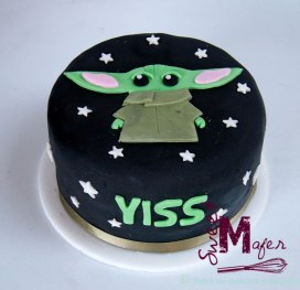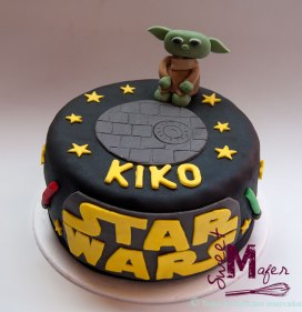 Laura era vecina mía, ella es venezolana y hace poco se fue con su familia a vivir a Chile, pero antes de irse, me encargó esta torta para el cumple de su novio. Una torta marmolada para 16 personas, decorada en azul medianoche, con el mastreo Yoda y la nave encima, el logo se Star Wars y la frase May the force be with you. Laura quedó muy contenta con el resultado y sorprendió a su novio.
