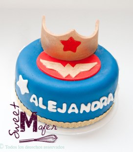 La mamá de Liliam me encargó esta torta de 6 porciones, de chocolate con capa de mora, para el cumple de su hija, la decoramos con temática de la Mujer Maravilla y les gustó mucho.
