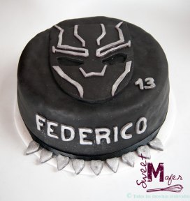 Federico cumplió 13 años y su mamá, Andrea, me encargó esta torta de chocolate con capa de frutos rojos para 25 personas, decorada en negro y con la máscara de su súper héroe favorito, Black Panther.