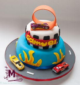 Santi cumplió 5 años y para su fiesta, su mamá me encargó esta torta para 50 personas, en masa marmolada, decorada con cuadros y un 5 formando una pista de carros. Ella me escribió después de la fiesta para decirme que la torta había quedado muy linda y muy rica, y para darme las gracias.