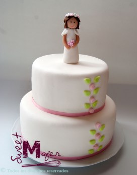 Empezamos la temporada de primeras comuniones y hoy les proponemos una linda y delicada torta para niña, en blanco, con florecitas y hojitas en rosado pálido y una niña vestida de primera comunión en la parte superior.