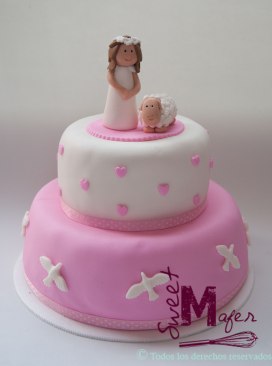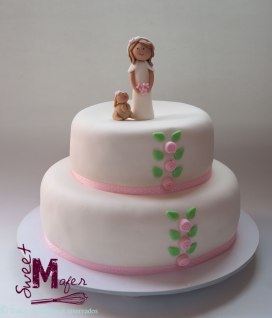El año pasado le hice a María Cecilia, una torta para humanos y cupcakes para perros, para la graduación de su perro. En esta ocasión, me encargó una torta para la primera comunión de su hija Mariana, hicimos una torta marmolada para 30, decorada en rosado y blanco, con palomitas y corazones, con una niña y una ovejita encima.