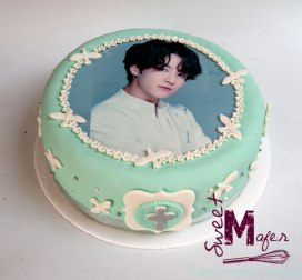 Silvana hizo la primera comunión y quería una torta con la foto de un cantante de BTS. Yo no hago normalmente tortas con impresiones comestibles, pero su mamá me trajo la foto para que la incorporáramos en la torta. Hicimos una torta para 30 personas en masa marmolada, decorada en verde menta, con detalles en blanco y plateado. También hicimos 30 galletas y 8 cupcakes decorados a juego. ¡Silvana y su mamá, estaban encantadas con el resultado!