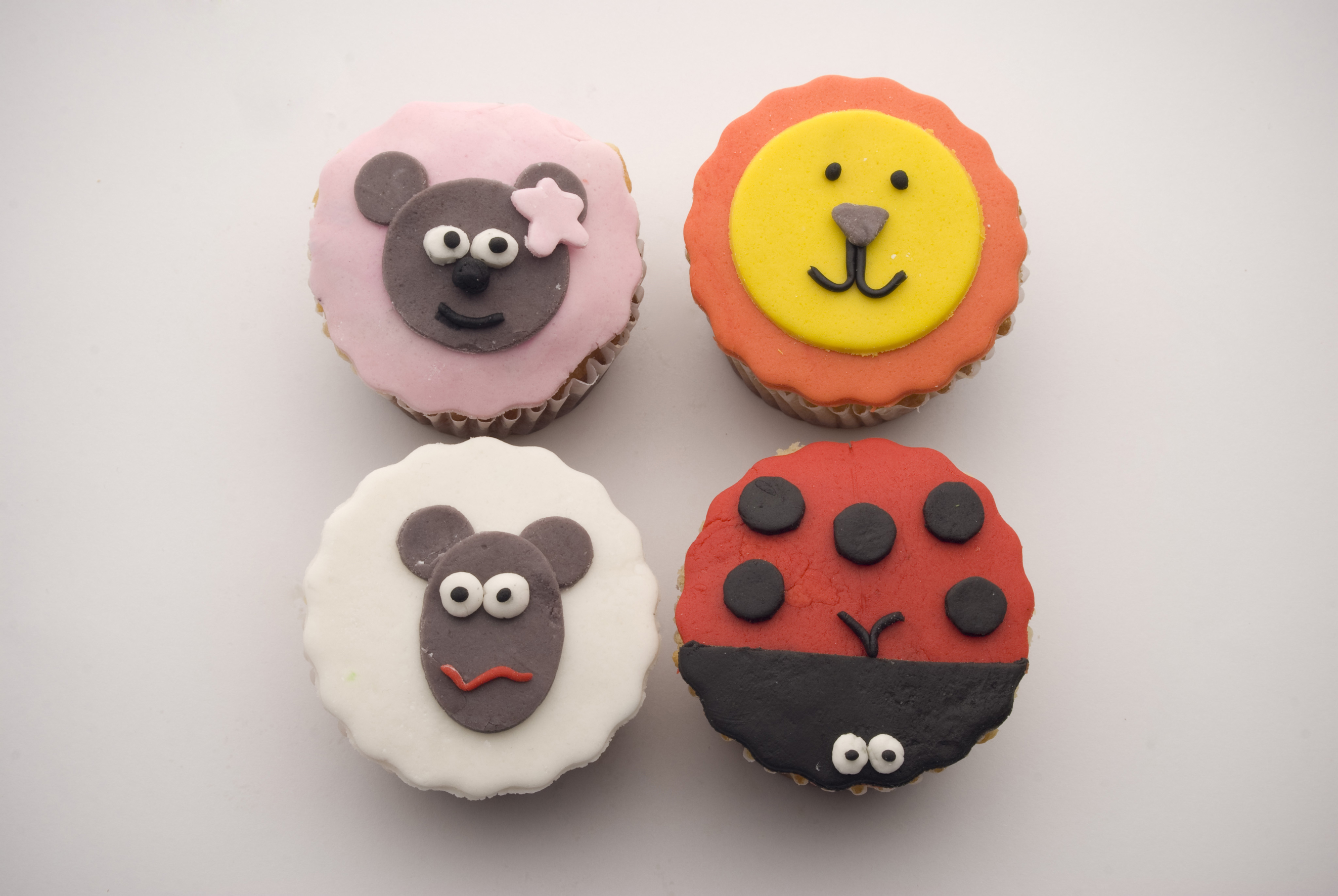 Cupcake de vainilla con tapa de pastillaje. Osito, león, oveja y mariquita. Se puede hacer cualquier animal.