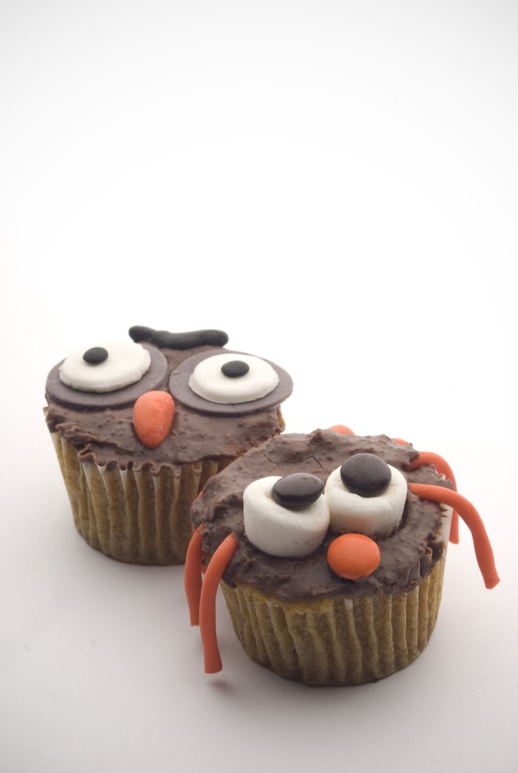 Cupcake de vainilla con cubierta de chocolate. La araña tiene patas de pastillaje, ojos de masmelo y M&M’S. El búho tiene todos los detalles en pastillaje.