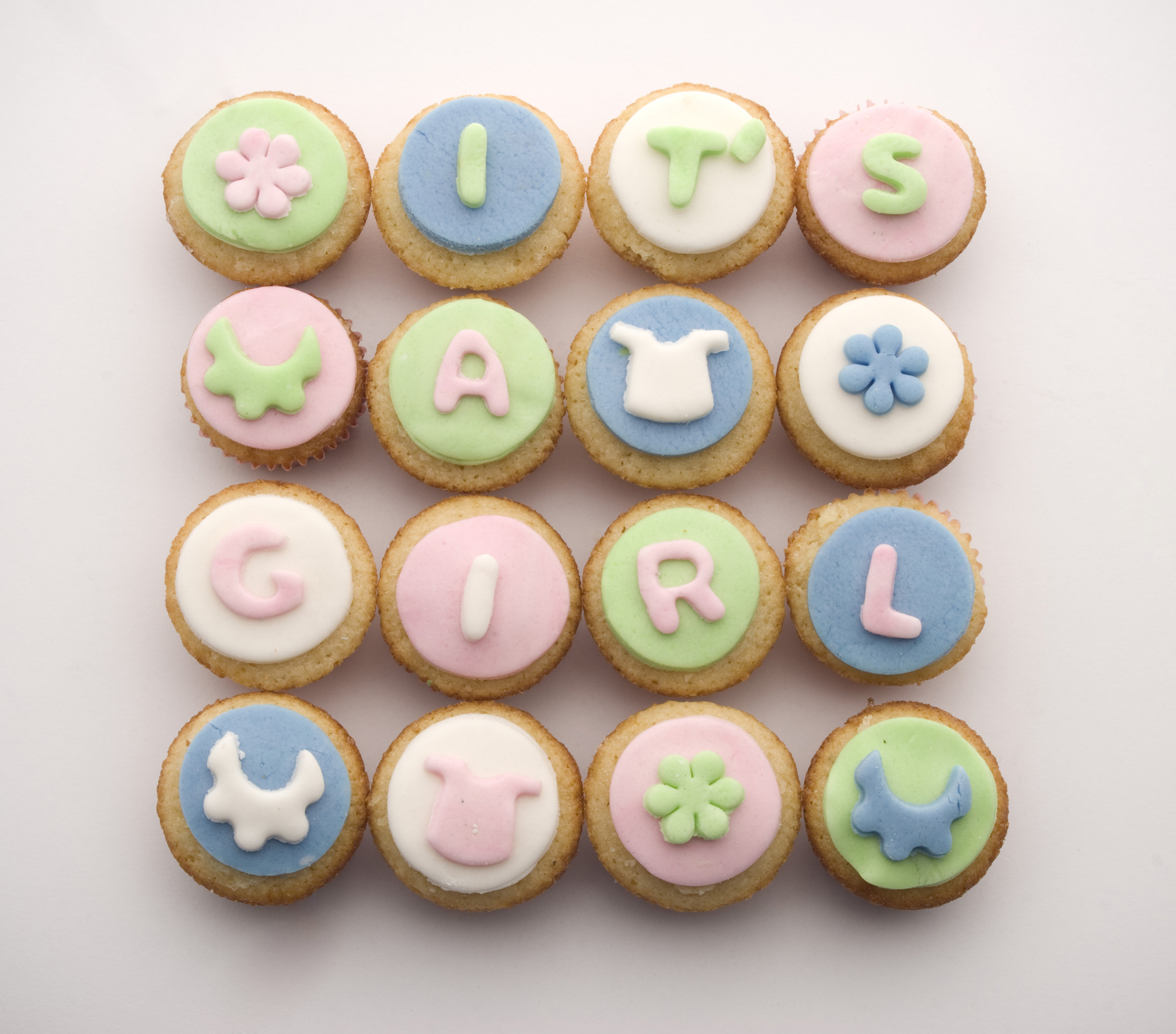 Cupcakes o minicupcakes de vainilla decorados con motivos de bebé, hechos en pastillaje, en colores claros. También disponibles con animalitos del arca de Noé, ositos, etc. Ideales para baby shower’s o para detalles para nuevos o futuros papás.