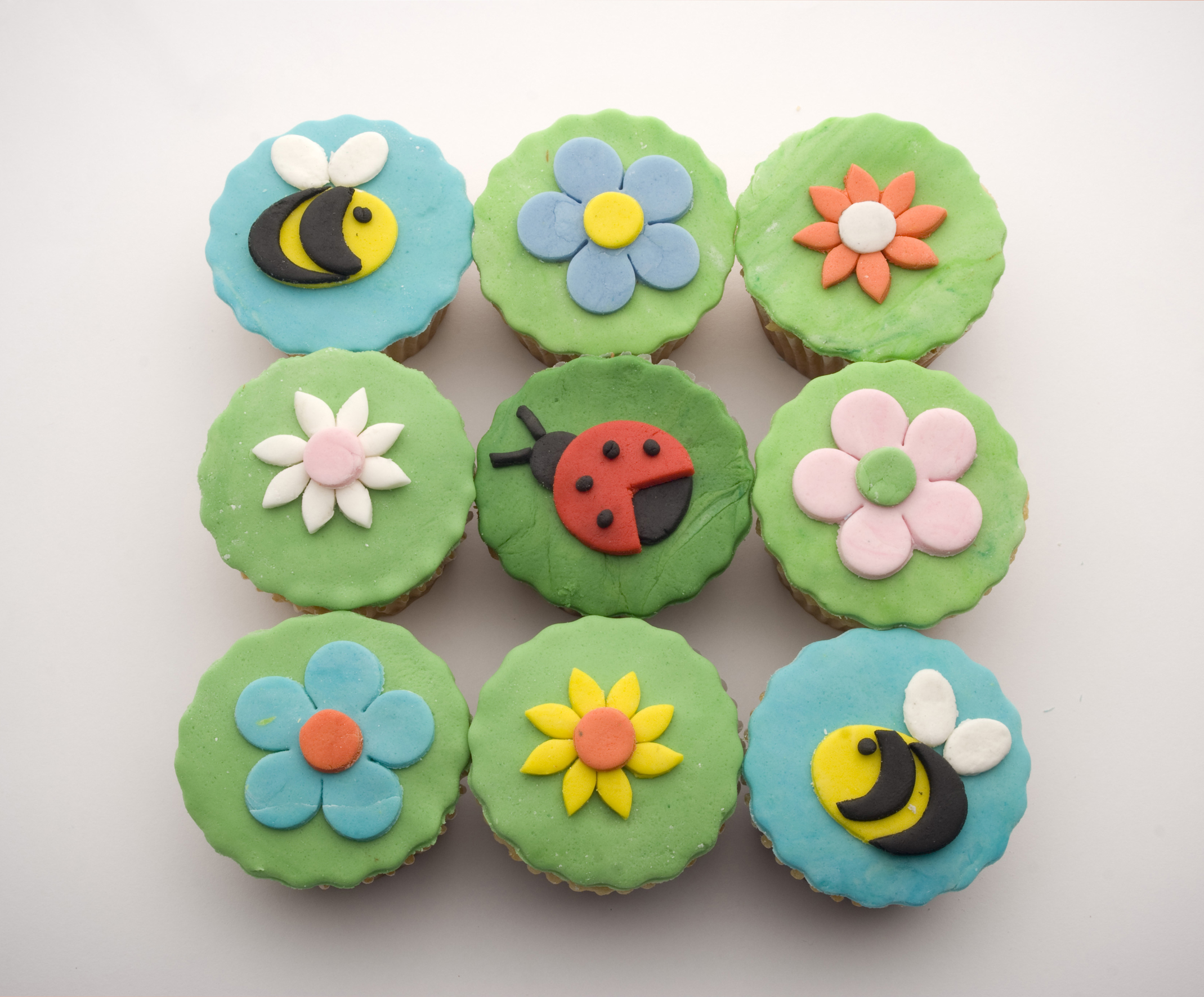 Caja por nueve cupcakes de vainilla, decorados con pastillaje con motivos del jardín, flores, abejas y mariquitas. Ideales para regalar o para llevar a una visita. Se entregan empacados en su caja con moño.