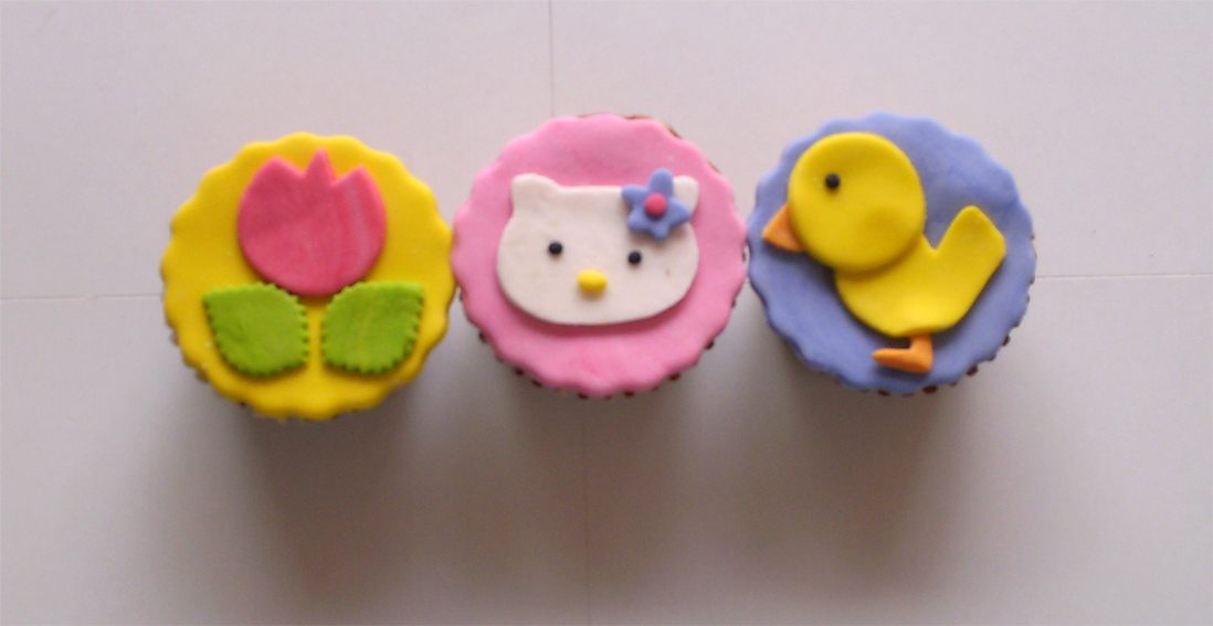 Cupcakes de vainilla decorados con cubierta de mantequilla y detalles hechos en pastillaje.
