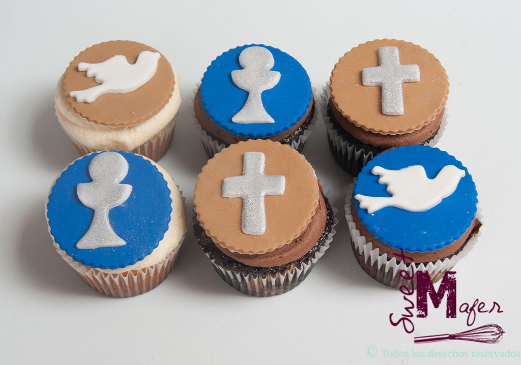 Cupcakes y galletas decorados en beige y azul, a juego con la decoración de la fiesta, para la primera comunión del hijo de Silvia.