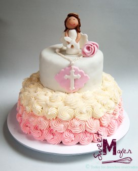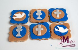 Edwin me encargó una torta marmolada para 30 personas, 30 galletas decoradas a juego y otras galletitas para la mesa de dulces de la celebración de la primera comunión de su hijita. ¡Les gustó mucho!