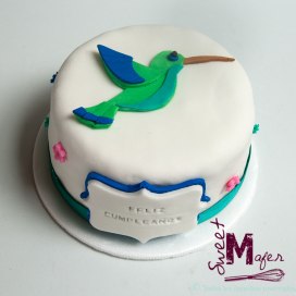 Torta de 6 porciones, de almendra y narnaja, decorada con un colibrí, para la mamá de María Alejandra