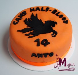 Torta de Percy Jackson para el cumple de mi hija Antonia. Torta negra de 10 porciones, se la hice sorpresa y le gustó mucho.
