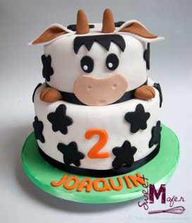 El nieto de Nubia cumplió años y le encantan las vacas, por eso me encargaron esta torta decorada como una vaquita. Era una torta de chocolate con arequipe para 16 personas y les gustó mucho.