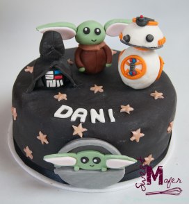 Torta de Starwars de chocolate con crema de chocolate parea el cumple de Dani, con Baby Yoda, BB8 y Darth Vadder. ¡Les gustó mucho!
