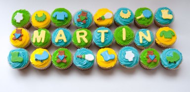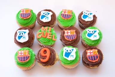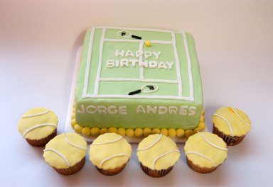 Este finde entregué los cupckaes para el cumple de Miguel, decorados con escudos del Barcelona y el Millos. Además una torta para Jorge Andrés, tema tennis, acompñada por cupcakes. A Mariana le hice unos cupcakes de la granja y otros de frambuesa y limón con corazones, pero por alguna extraña razón, no encuentro la foto. Además, hoy entregué otra torta de la casa Mickey Mouse para el hermanito de una compañera del cole de mi hija, y ayer tuvimos unas onces para una amiga que va a tener una bebé y le hice la torta de pajaritos que pueden ver en las fotos.