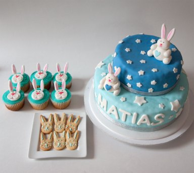 El bautizo de Matías, torta marmolada de 2 pisos decorada con conejos y estrellas, 30 cupcakes de conejos con orejas paradas y 100 galletas de carita de conejo, todo en tonos azul y blanco.