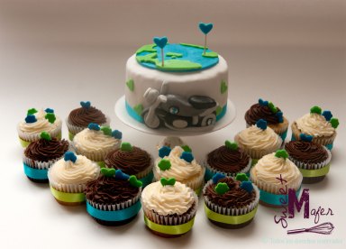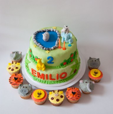 El cumple de Emilio, torta marmolada de 1,5 libras y 15 cupcakes a juego de animales de la selva.