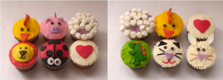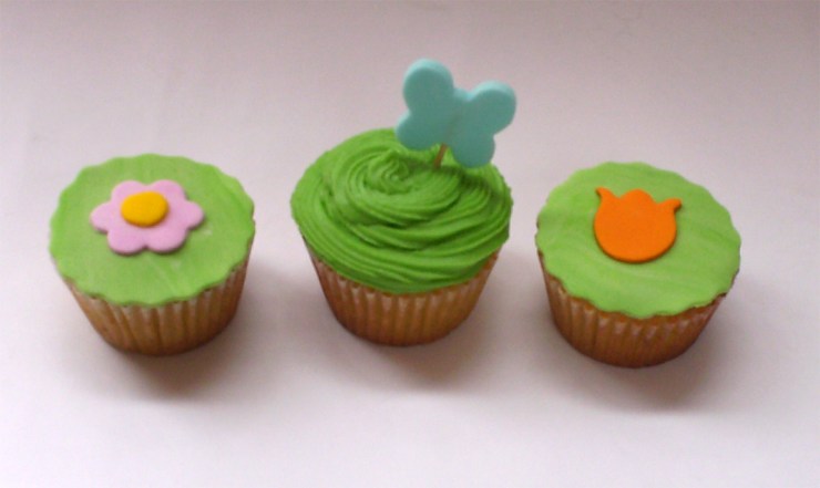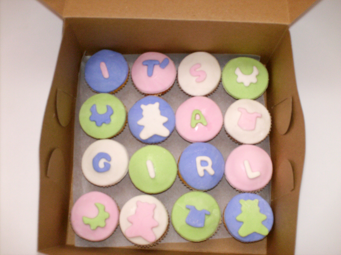 Hoy estuve trabajando en unos minicupcakes para las sobrinitas de Ligia que están por nacer, María Catalina y Juanita. Hice cupcakes decorados con cubierta de mantequilla y otros con pastillaje a juego. ¡Aquí van!