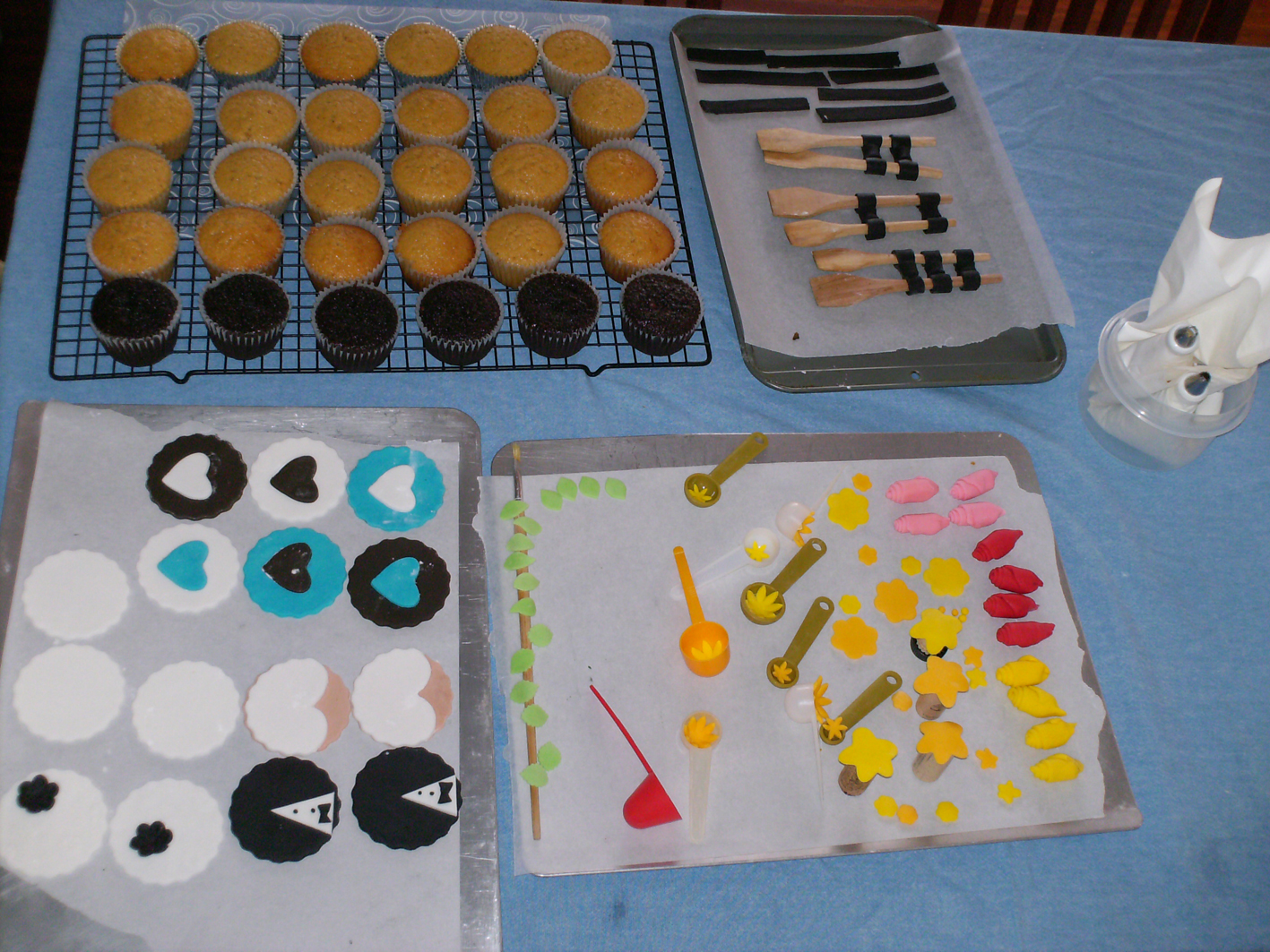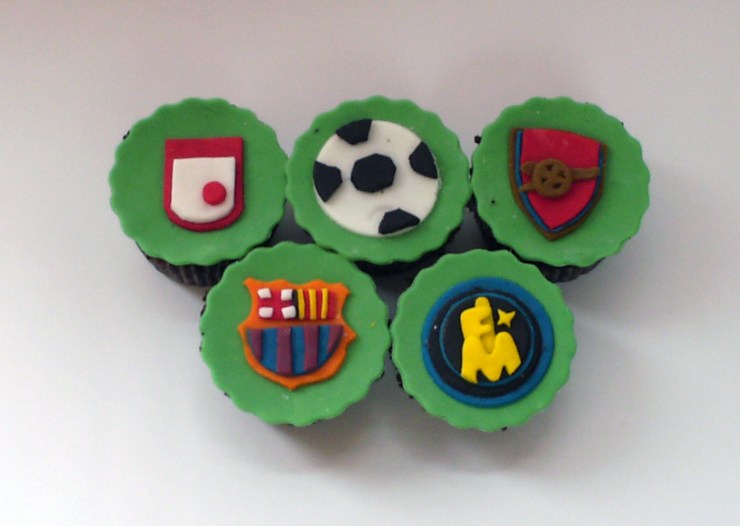 Hola, esta mañana estuve ocupada acabando de hornear y decorar los cupcakes para el cumpleaños de Pipe, el hijo de un amigo nuestro. Hice los escudos del Barcelona, el Inter de Milán, el Arsenal y el Santa Fé, equipos que siguen Pipe y su papá. Además un par de balones de fútbol y unos Hello Kitties para la primita de Pipe. Aquí va una foto.