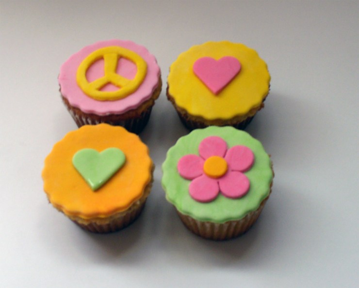 Hoy quiero mostrarles lo que hice para mis sobrinitas. Para Nicole decoré unos cupcakes con el tema peace & love, y para Sasha hice unos de princesas. Tuve una semana ocupada preparándome para recibir la visita, por eso no tuve tiempo de escribir nada…. Aquí van las fotos, ¡espero opiniones!