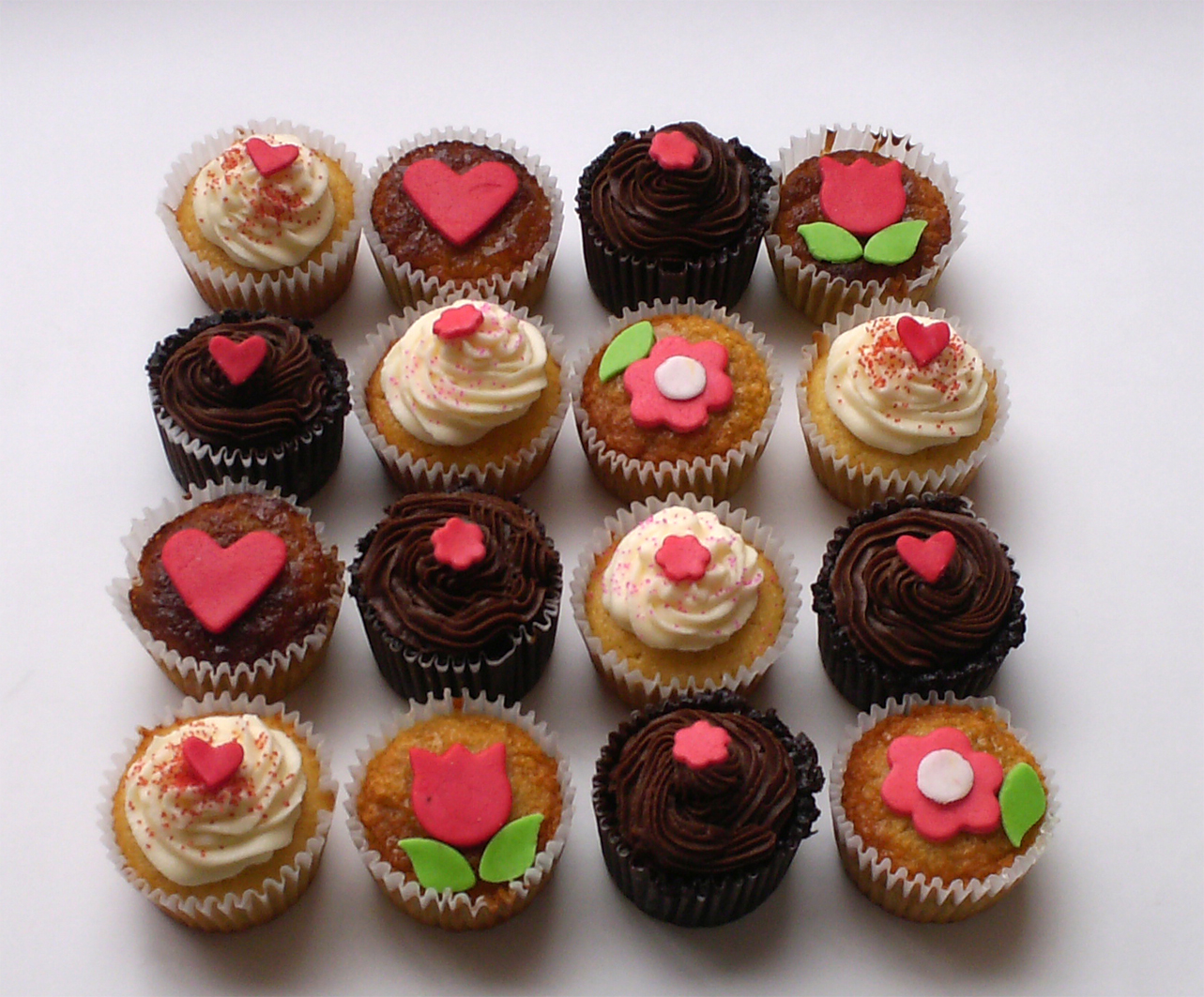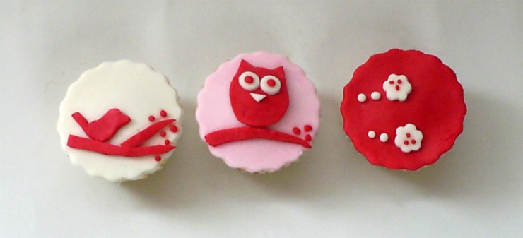 Cupcakes de flores y corazones en rojo y crudo, con cintas a juego.