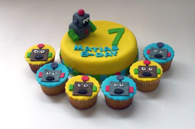 Hoy entregué una torta y cupcakes a juego tema robot para el cumpleaños de Matías. Además estuve horneando otros encargos y aún tengo cosas por hacer, entre ellas moldear una vaca. Les comparto una foto de la torta y cupcakes de robots.