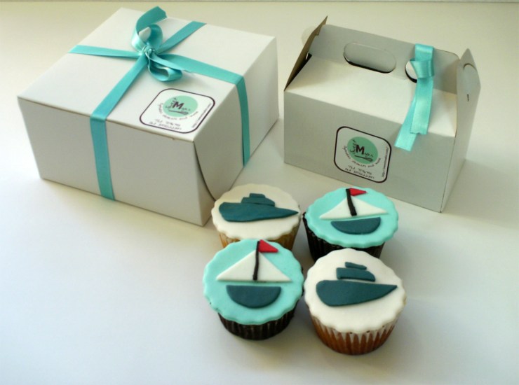 Hola, después de un finde con bastante trabajo, estoy lista para entregar un pedido para una amiga del colegio que viene a Bogotá por trabajo y necesitaba unos regalitos corporativos. Su empresa es de agenciamiento marítimo y le hice unos cupcakes con su logo y otros con barcos, de vainilla y chocolate, organizados en cajas de 2 y de 4 para que puede llevar detalles en sus visitas a clientes. Aquí va una foto.